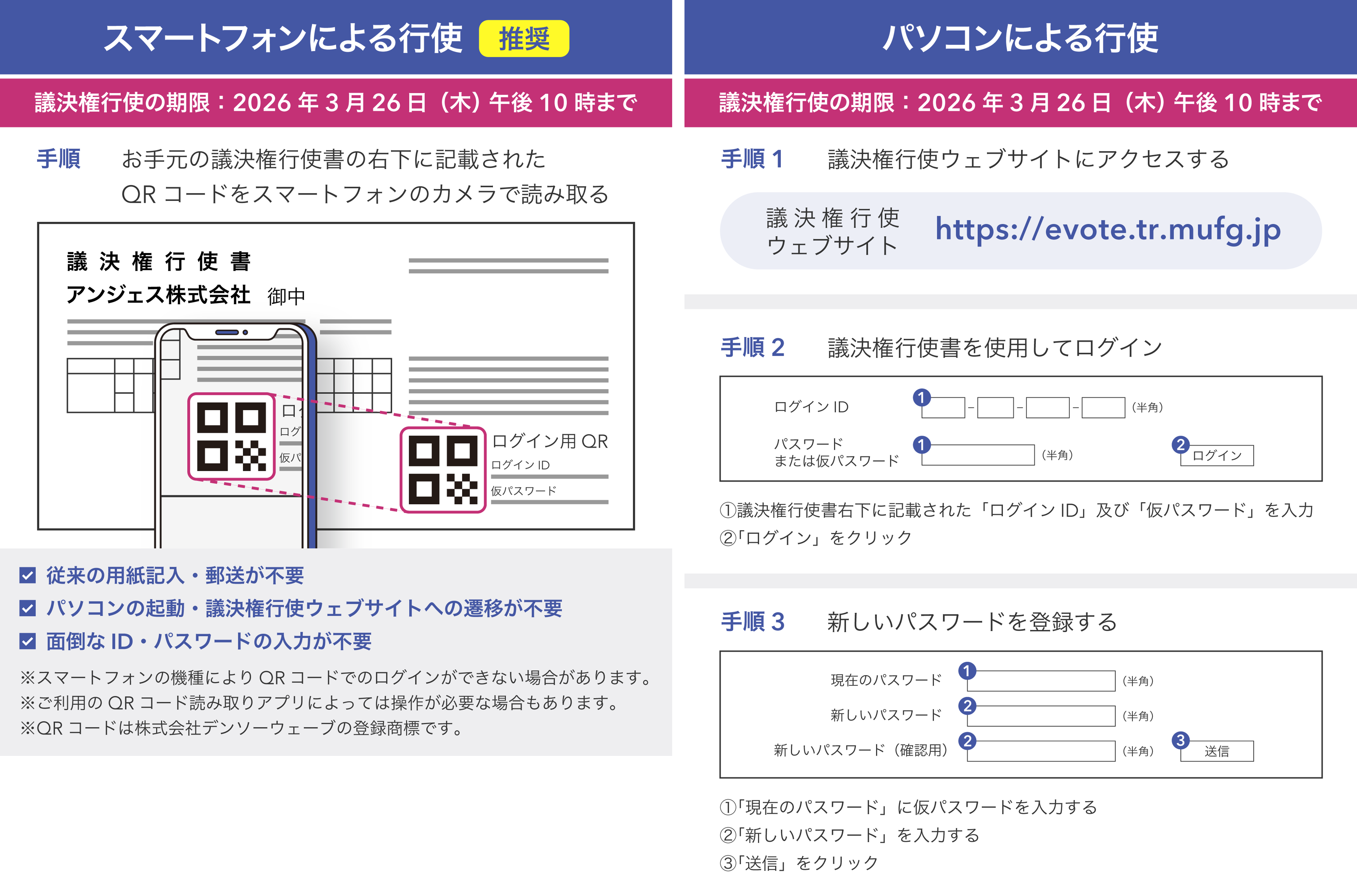 スマートフォン又はパソコン等から、議決権行使ウェブサイトにアクセスし、賛否をご登録ください。